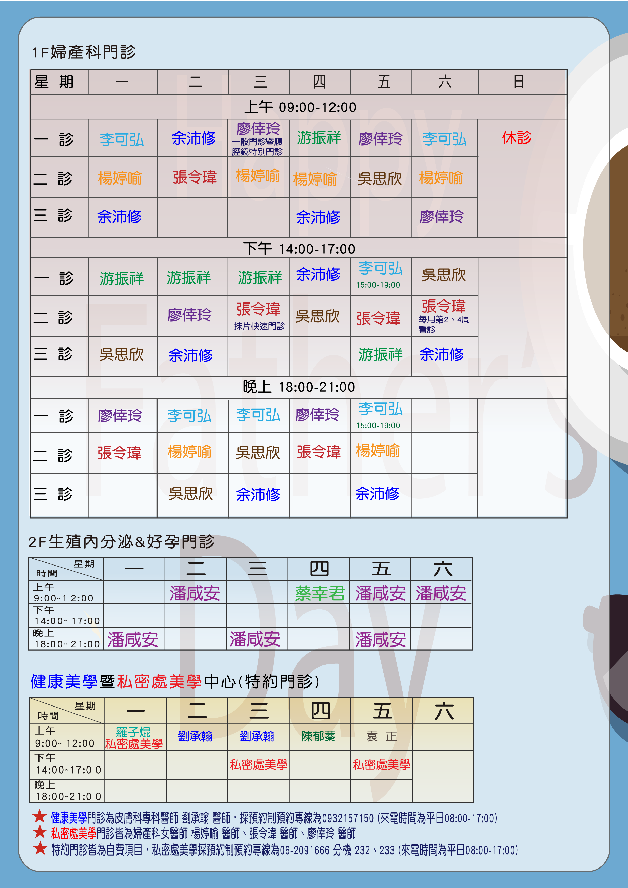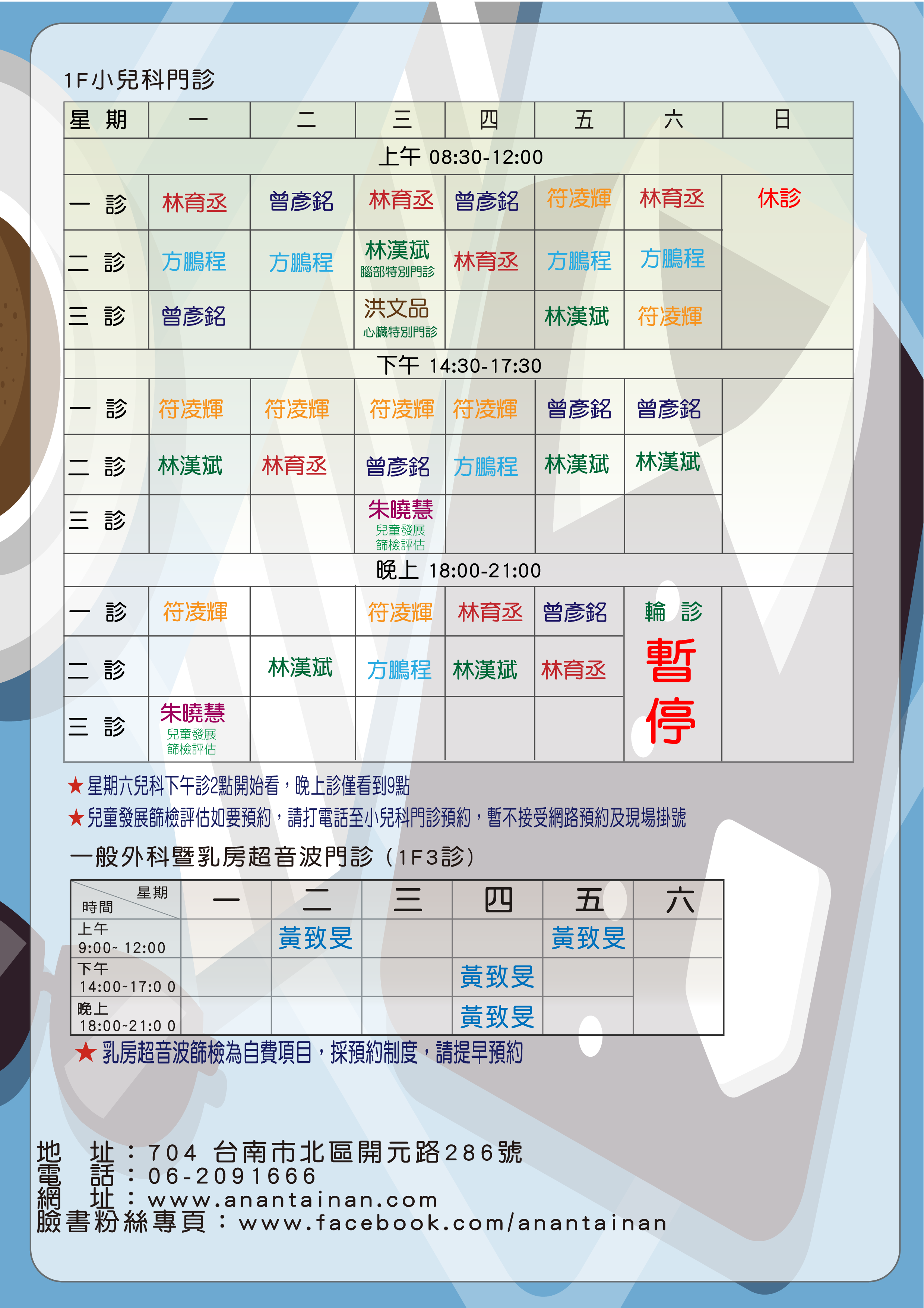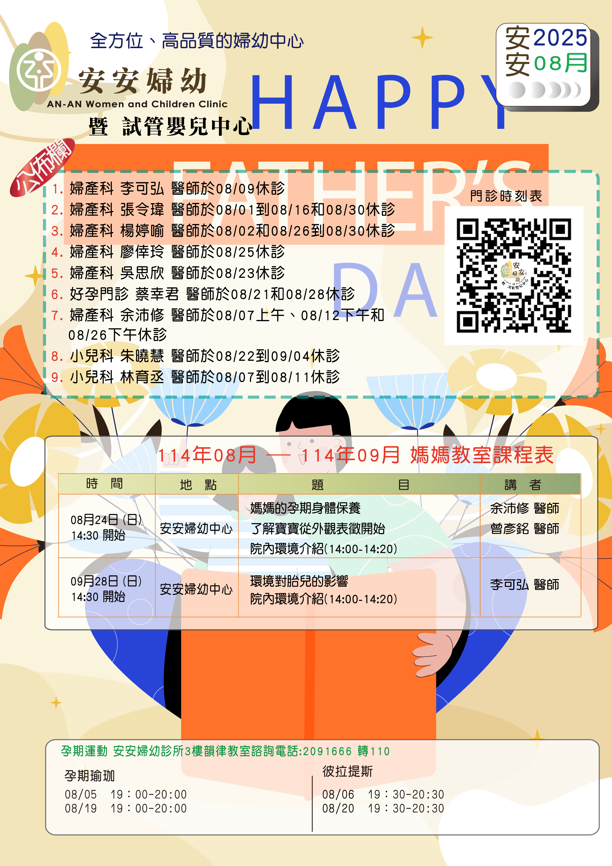 安安婦幼中心 2025年八月份公佈事項、課程表及門診表