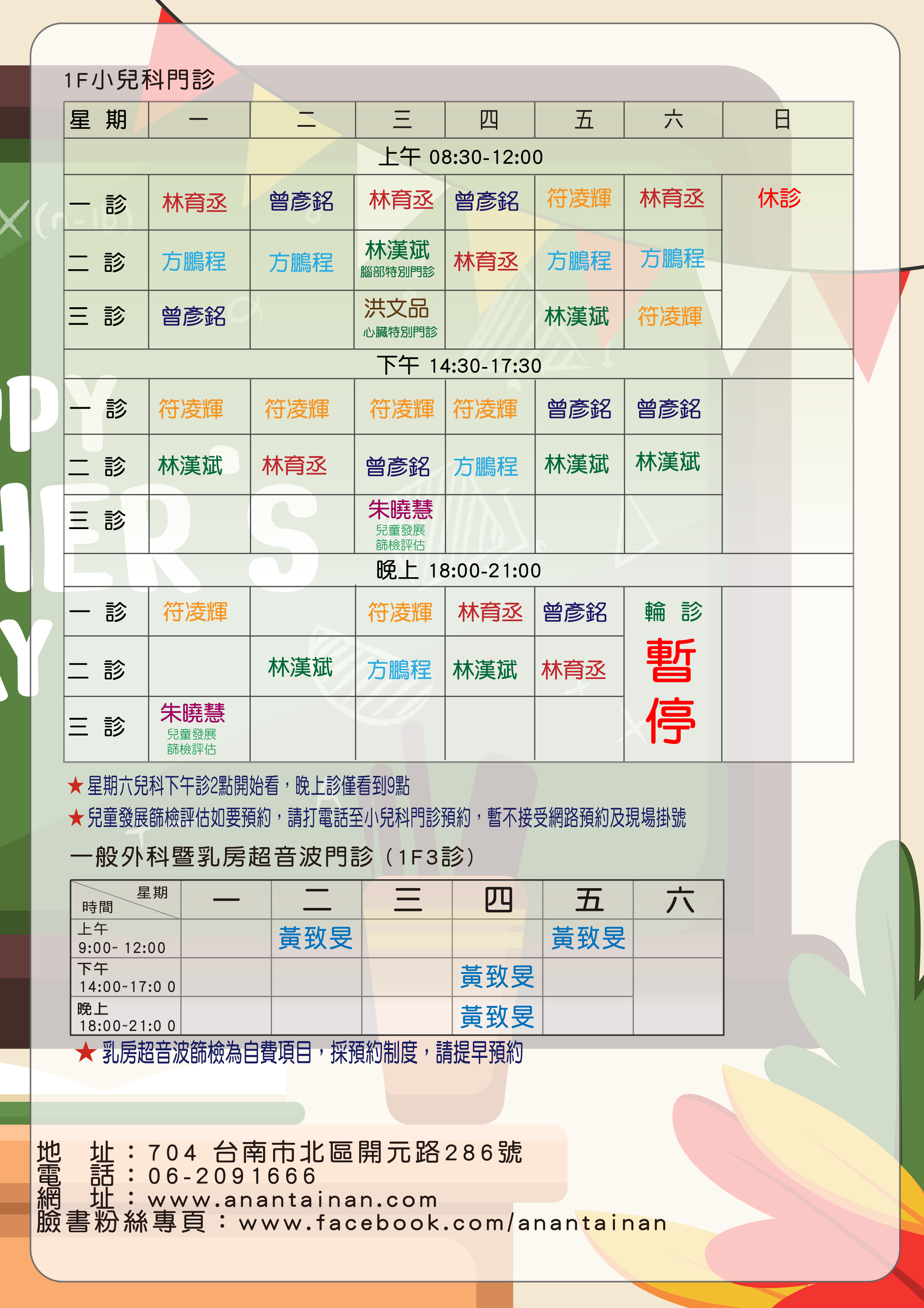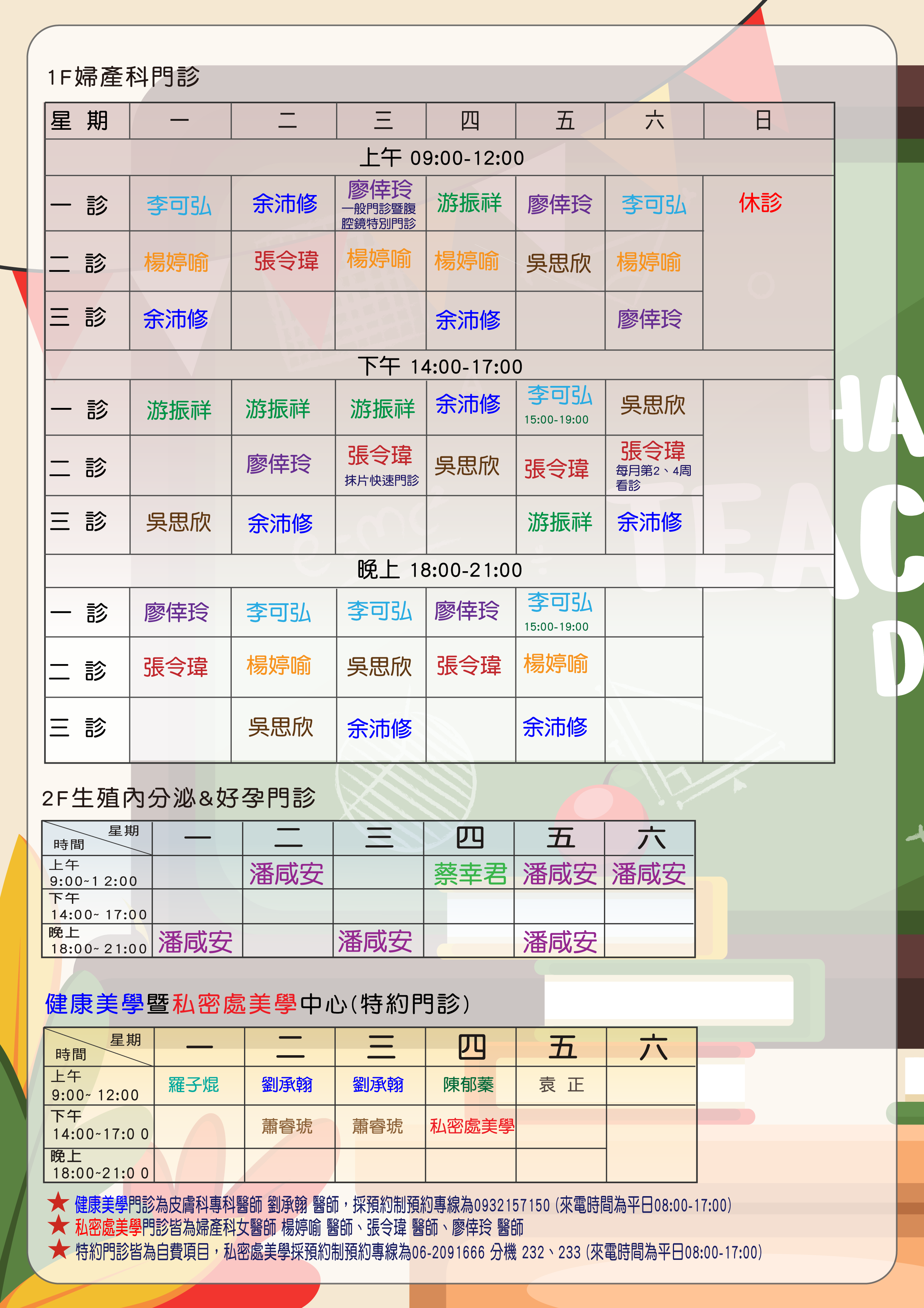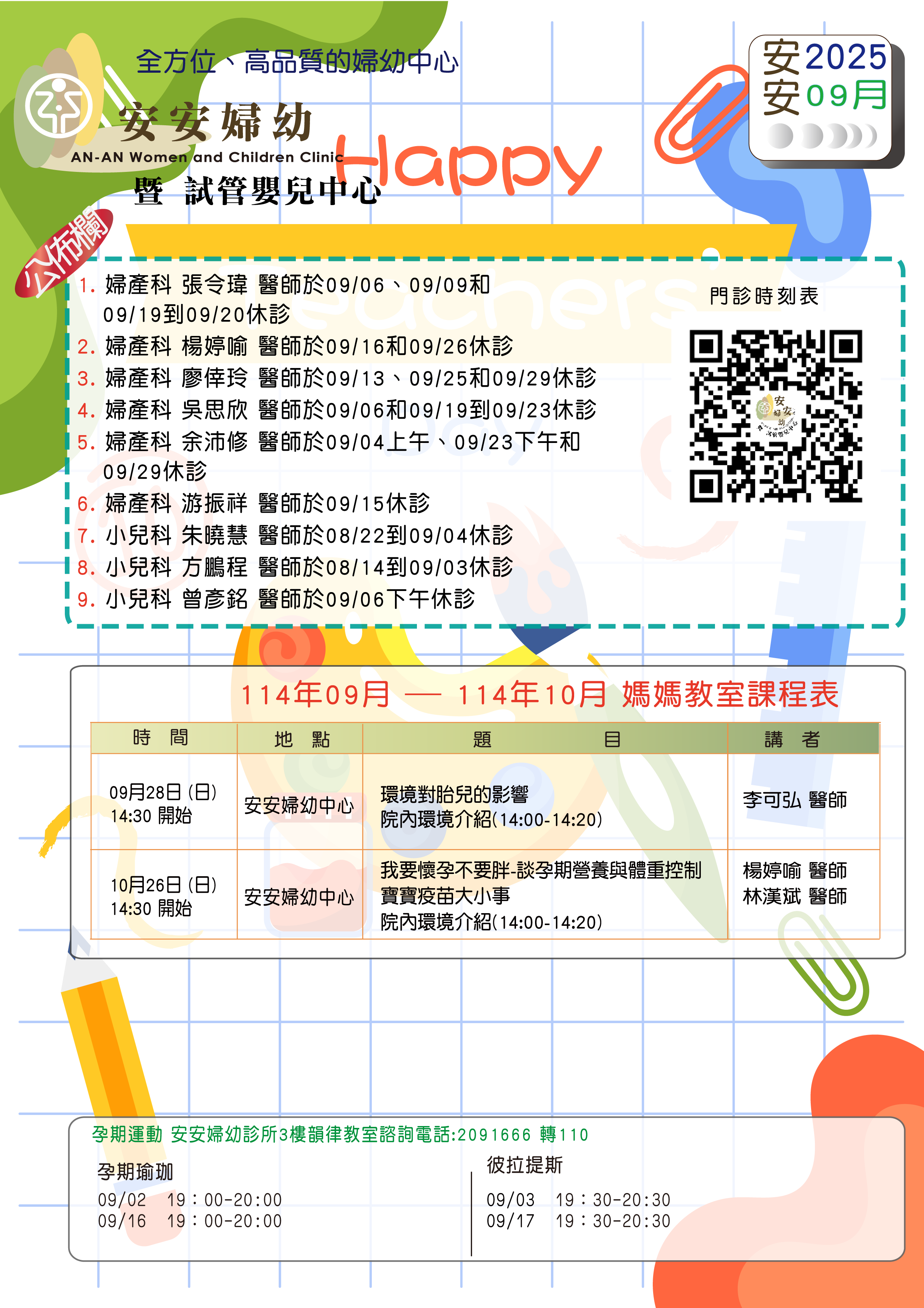 安安婦幼中心 2025年九月份公佈事項、課程表及門診表